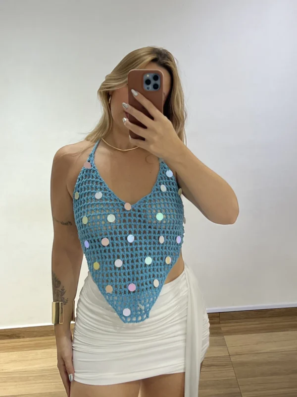 Com modelagem frente única e amarração no pescoço, ele valoriza o colo e deixa a produção moderna e sofisticada.